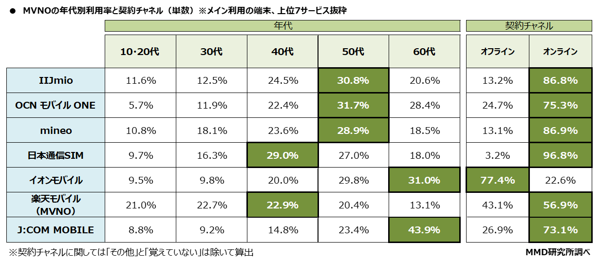 次に、契約チャネルを見ると、IIJmio、OCN モバイル ONE、mineo、日本通信SIM、楽天モバイル(MVNO)、J:COM MOBILEはオンライン、イオンモバイルのみオフラインが多い結果となった。