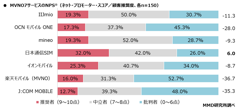 NPS®は「日本通信SIM」が6.0でトップ、次いで「イオンモバイル」が-8.7、「mineo」が-9.3