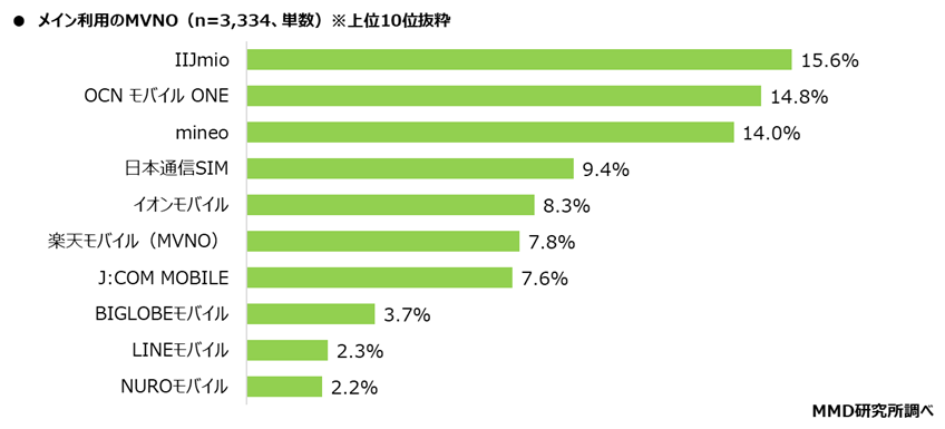 メイン利用のサービスは「IIJmio」が15.6%でトップ、次いで「OCN モバイル ONE」が14.8%