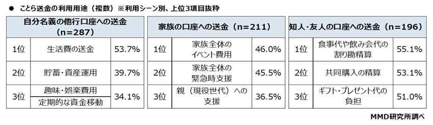 次に、ことら送金の利用シーンごとに利用用途を聞いたところ(複数回答可)、自分名義の他行口座への送金(n=287)は「生活費の送金」が53.7%、家族の口座への送金(n=211)は「家族全体のイベント費用」が46.0%、知人・友人の口座への送金(n=196)は「食事代や飲み会代の割り勘精算」が55.1%とそれぞれ最多となった。