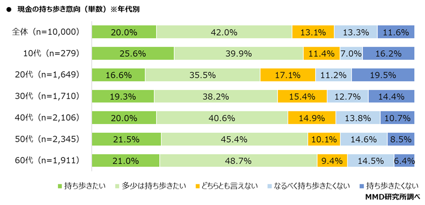 これを年代別でみると、最も持ち歩きたい意向が高いのは60代(n=1,911)で69.8%となり、持ち歩きたくない意向が高いのは20代(n=1,649)で30.8%となった。