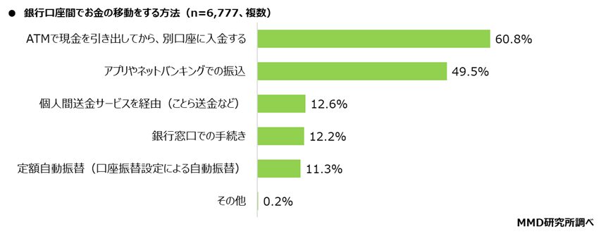 銀行口座間でお金を移動させている人は76.3%、移動方法は「ATMで現金を引き出してから、別口座に入金する」が60.8%で最多、次いで「アプリやネットバンキングでの振込」が49.5%