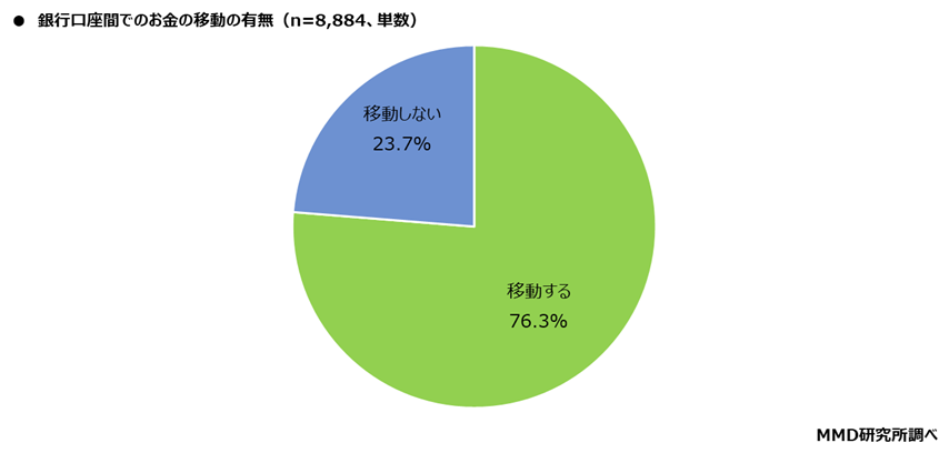 銀行口座を持っている8,884人を対象に、銀行口座間でのお金の移動について聞いたところ、「移動する」が76.3%、「移動しない」が23.7%となった。