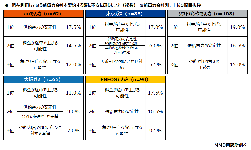 不安を感じた項目の中では、「料金が途中で上がる可能性」「供給電力の安定性」という項目が上位にラインクインする結果となった。