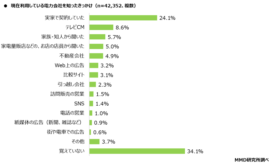 電力会社を契約していると答えた42,352人を対象に、現在利用している電力会社を知ったきっかけを聞いたところ(複数回答可)、「実家で契約していた」が24.1%と最も多く、次いで「テレビCM」が8.6%、「家族・知人から聞いた」が5.7%となった。