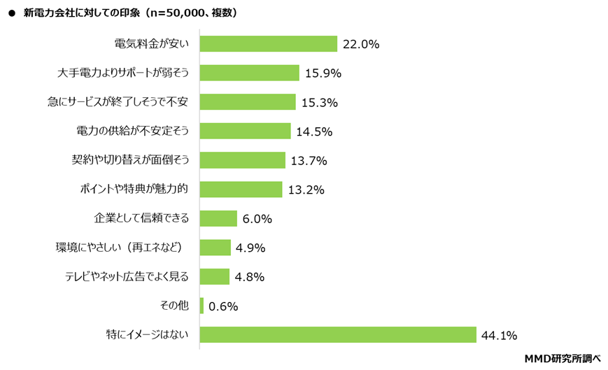 20歳~69歳の男女50,000人を対象に、新電力会社に対しての印象を聞いたところ(複数回答可)、「電気料金が安い」が22.0%と最も多く、次いで「大手電力よりサポートが弱そう」が15.9%、「急にサービスが終了しそうで不安」が15.3%となった。