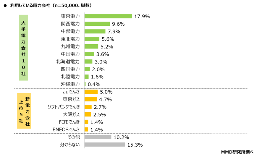 利用している大手電力会社の1位は「東京電力」、新電力会社の1位は「auでんき」
