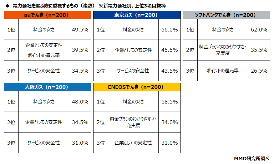 新電力会社利用者が電力会社を選ぶ際に重視するもの「料金の安さ」がいずれもトップ