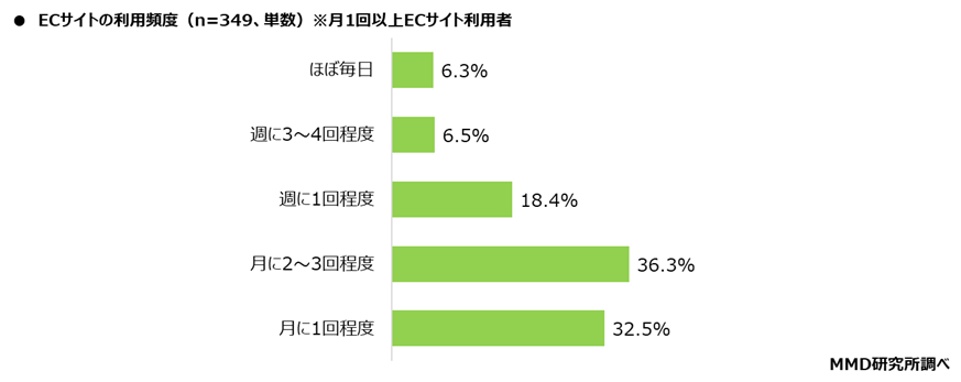 次に、月1回以上ECサイトを利用する349人を対象に、利用頻度を聞いたところ、「月に2~3回程度」が36.3%と最も多く、次に「月に1回程度」が32.5%、「週に1回程度」が18.4%となった。