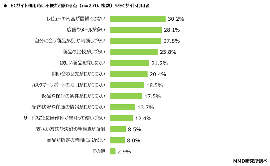 次に、ECサイト利用時に不便だと感じると回答した270人を対象に、不便だと感じる点を聞いたところ(複数回答可)、「レビューの内容が信頼できない」が30.2%と最も多く、次に「広告やメールが多い」が28.1%、「自分に合う商品かどうか判断しづらい」が27.8%となった。