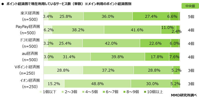 中央値で見ると楽天経済圏(n=500)は5個、PayPay経済圏(n=500)、ドコモ経済圏(n=500)、au経済圏(n=500)は4個、Vポイント経済圏(n=250)、イオン経済圏(n=250)は3個となった。