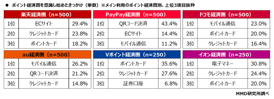 ポイント経済圏を意識し始めたきっかけは、楽天経済圏は「ECサイト」、PayPay経済圏は「QRコード決済」、ドコモ経済圏とau経済圏は「モバイル通信」、Vポイント経済圏は「ポイントカード」、イオン経済圏は「電子マネー」