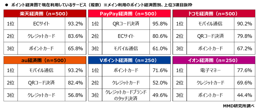ポイント経済圏メイン利用者2,500人を対象に、ポイント経済圏で現在利用しているサービスを聞いたところ(複数回答可)、楽天経済圏(n=500)は「ECサイト」が93.2%、PayPay経済圏(n=500)は「QRコード決済」が95.8%、ドコモ経済圏(n=500)は「モバイル通信」が90.2%、au経済圏(n=500)は「モバイル通信」が93.2%、Vポイント経済圏(n=250)は「ポイントカード」が71.6%、イオン経済圏(n=250)は「電子マネー」が77.6%とそれぞれトップになった。