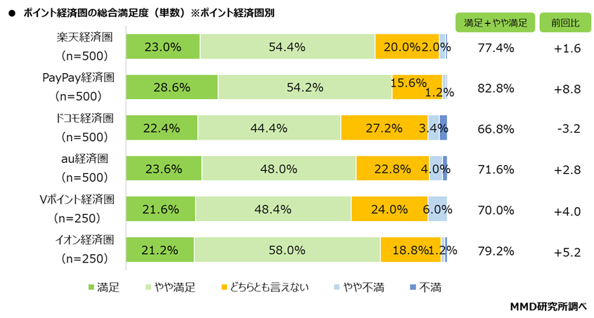 ポイント経済圏のうち、総合満足度は「PayPay経済圏」が82.8%でトップ、前回調査から最も伸びているのは「PayPay経済圏」で8.8ポイント増