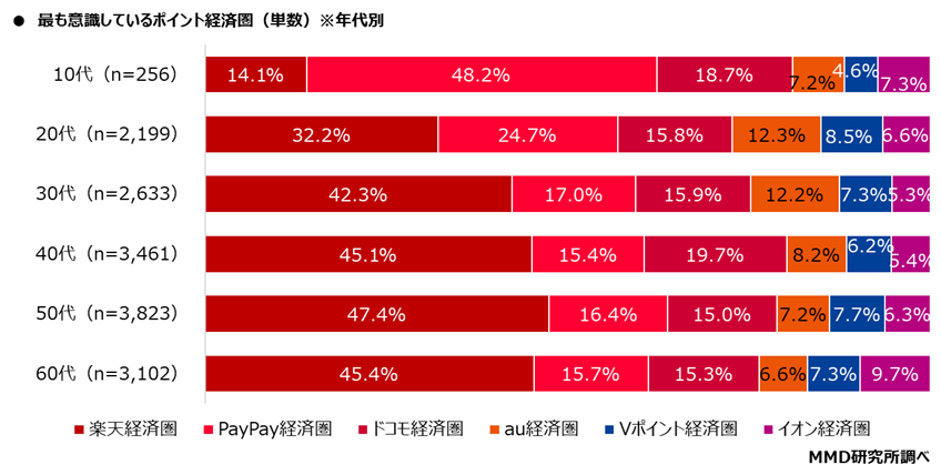 これを年代別でみると、10代(n=256)は「PayPay経済圏」「ドコモ経済圏」「楽天経済圏」、20代(n=2,199)、30代(n=2,633)、50代(n=3,823)、60代(n=3,102)は「楽天経済圏」「PayPay経済圏」「ドコモ経済圏」、40代(n=3,461)は「楽天経済圏」「ドコモ経済圏」「PayPay経済圏」の順で多い結果となった。