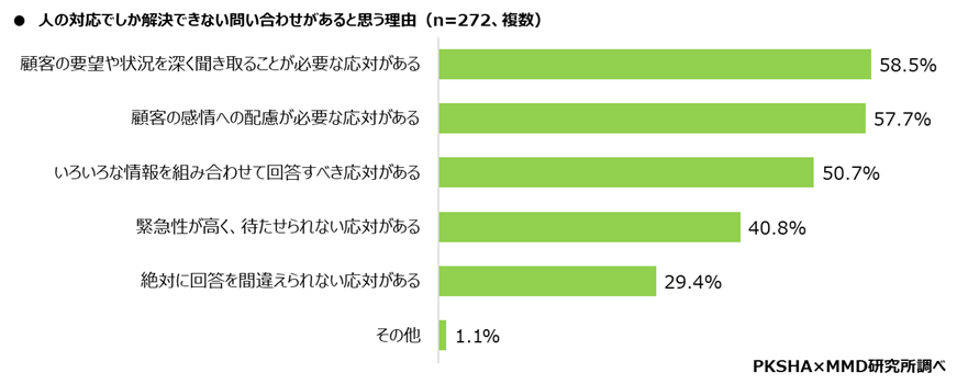 次に、人の対応でしか解決できない問い合わせがあると回答した272人を対象に、人の対応でしか解決できない問い合わせがあると思う理由を聞いたところ(複数回答可)、「顧客の要望や状況を深く聞き取ることが必要な応対がある」が58.5%と最も多く、次に「顧客の感情への配慮が必要な応対がある」が57.7%、「いろいろな情報を組み合わせて回答すべき応対がある」が50.7%となった。