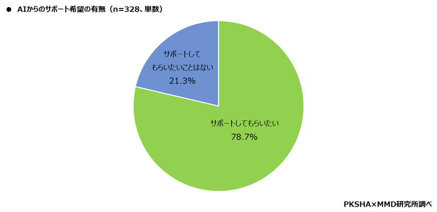 コールセンター従事者328人を対象に、有人対応の際に、AIにサポートしてもらいたいと思うものがあるか聞いたところ、「サポートしてもらいたい」が78.7%、「サポートしてもらいたいことはない」が21.3%となった。