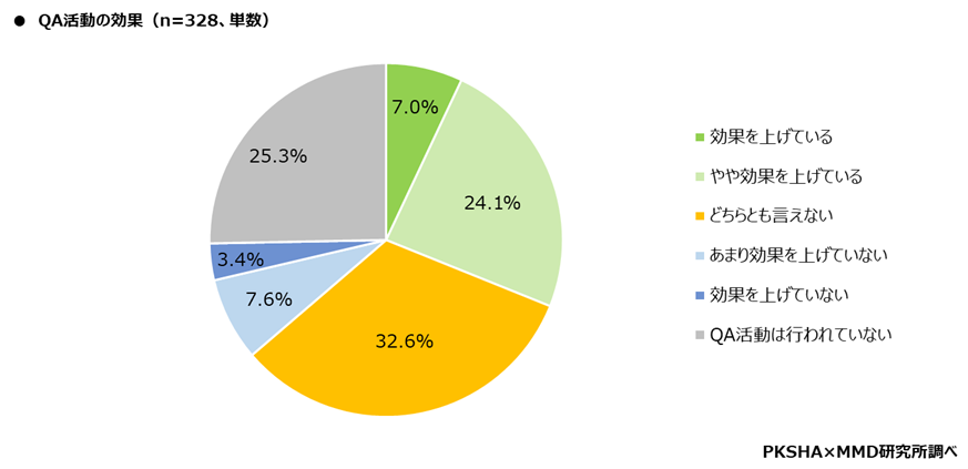 コールセンター従事者328人を対象に、コールセンターでのQA(応対品質の管理や改善)活動の効果について聞いたところ、「効果を上げている」が7.0%、「やや効果を上げている」が24.1%となり、効果を上げていると感じている人は31.1%となった。