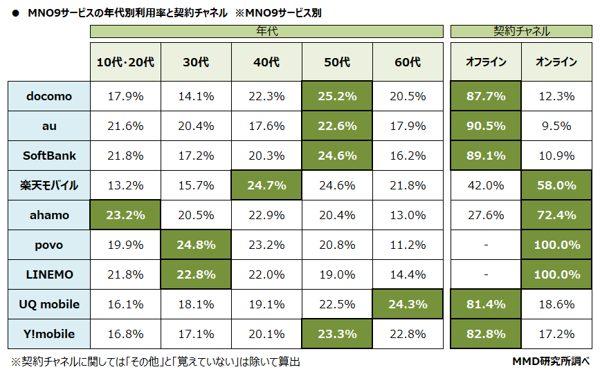 次に、契約チャネルを見ると、docomo、au、SoftBank、UQ mobile、Y!mobileはオフライン、楽天モバイル、ahamo、povo、LINEMOはオンラインが多い結果となった。