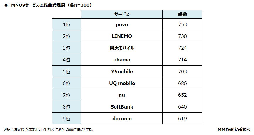 MNOの総合満足度は前回に引き続き「povo」が753ptでトップ、次いで「LINEMO」が738pt