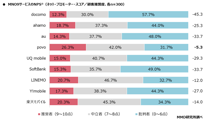 MNOを利用している2,700人(各n=300)を対象に、家族や友人にお薦めしたいかどうか10点満点の点数をつけてもらい、9~10点が推奨者、7~8点を中立者、0~6点を批判者とし、推奨者から批判者を引いたNPS®(ネット・プロモーター・スコア/顧客推奨度)を出したところ、サービス別のNPS®は、「povo」が-5.3と最も高く、次いで「LINEMO」が-12.0となった。