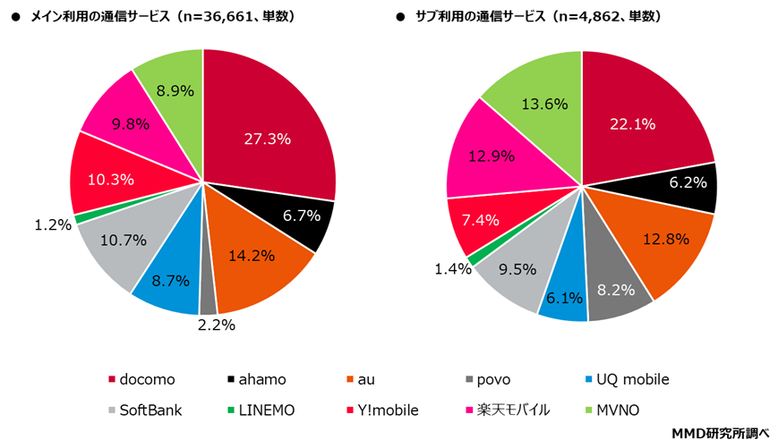 「ahamo」「povo」「LINEMO」を合わせたオンライン専用プランの割合は15.7%、「Y!mobile」「UQ mobile」を合わせたキャリアサブブランドの割合は13.5%となった。「MVNO」を契約している割合は13.6%となった。