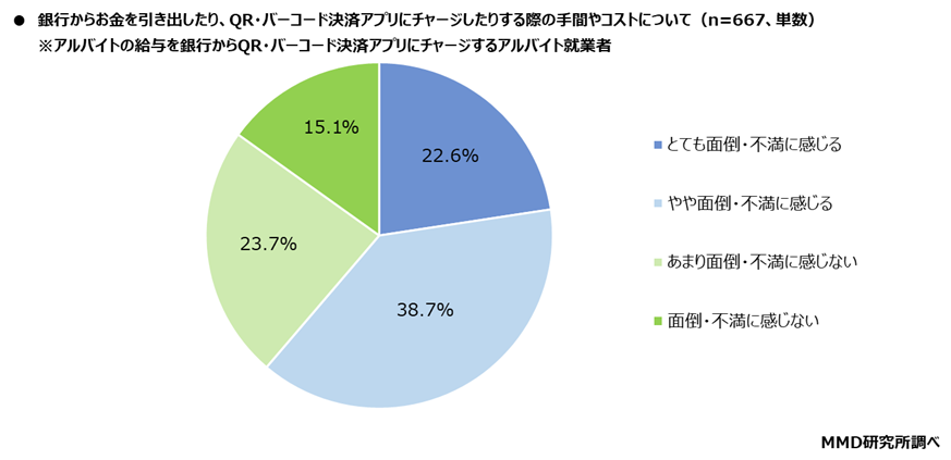 次に、アルバイトの給与を銀行から「QR・バーコード決済アプリにチャージする」と回答した667人を対象に、銀行からお金を引き出したり、QR・バーコード決済アプリにチャージしたりする際の手間やコストについて聞いたところ、「とても面倒・不満に感じる」が22.6%、「やや面倒・不満に感じる」が38.7%とあわせて61.2%が面倒・不満に感じると回答した。
