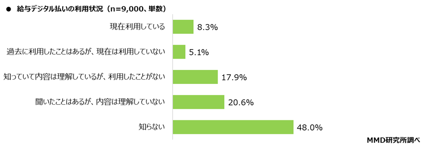 15歳~39歳の男女9,000人を対象に、「給与デジタル払い」を知っているか聞いたところ、「知らない」が48.0%と最も多く、次に「聞いたことはあるが、内容は理解していない」が20.6%、「知っていて内容は理解しているが、利用したことがない」が17.9%となった。