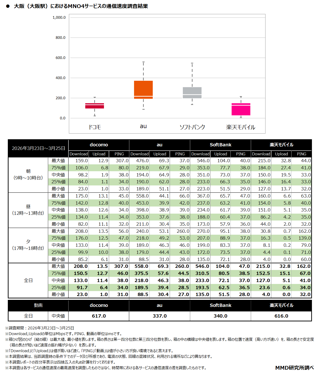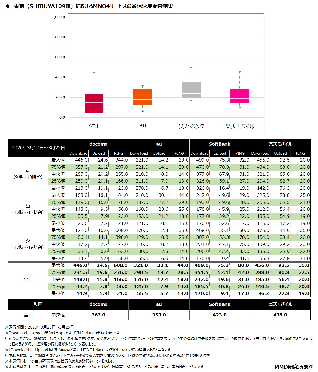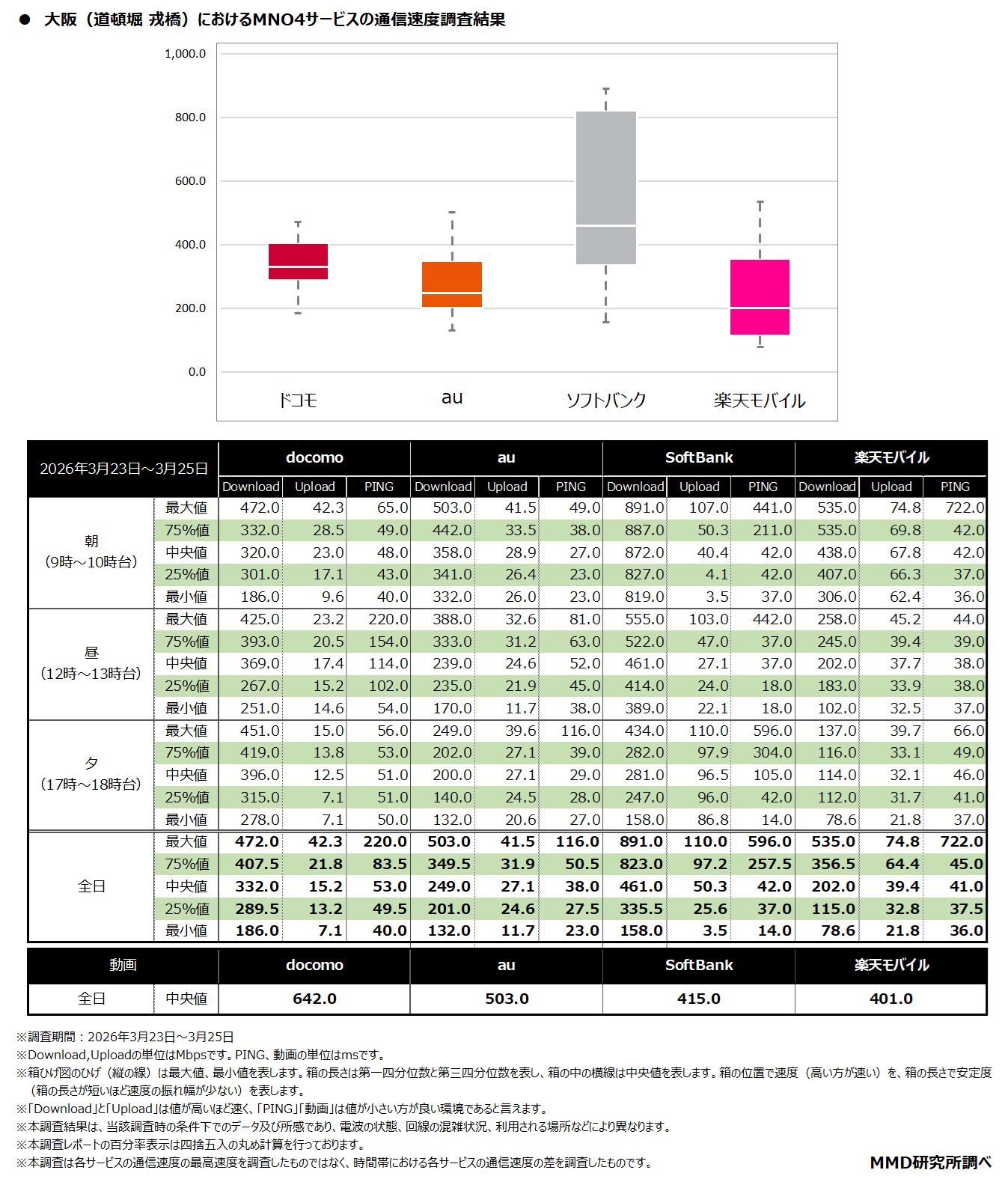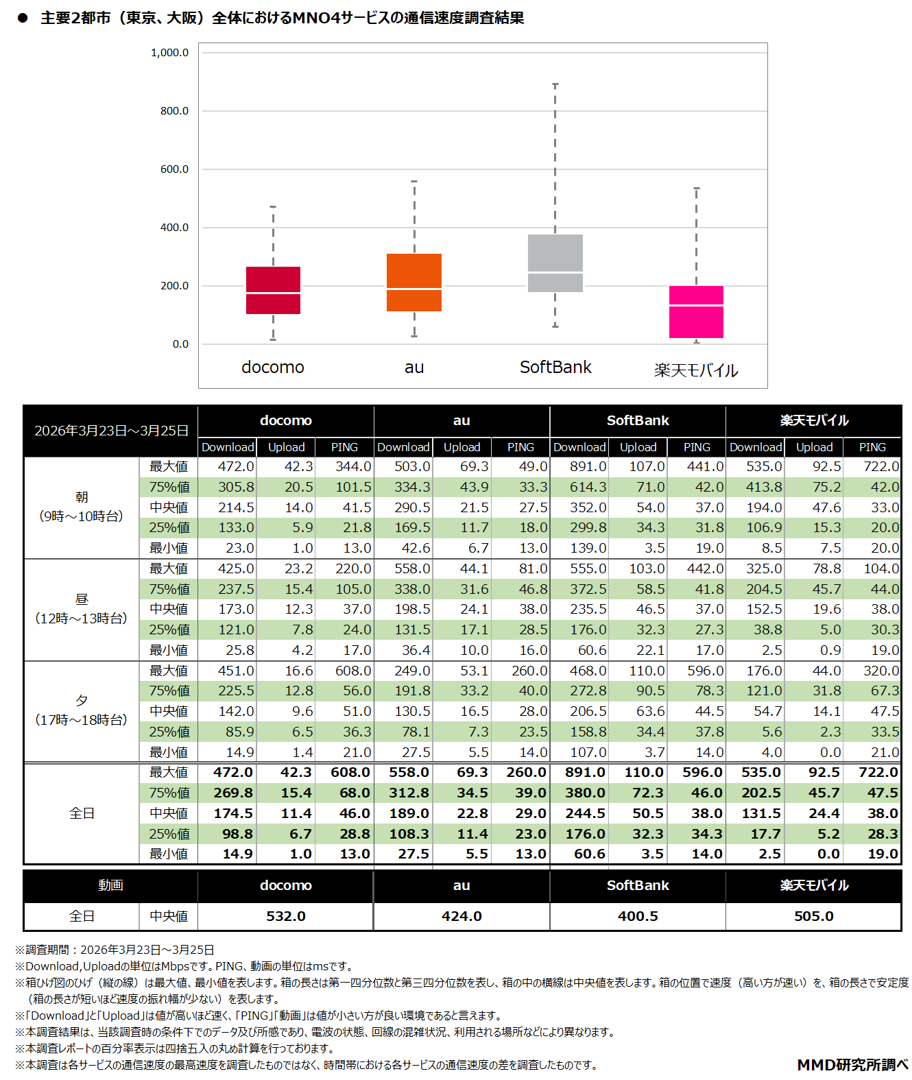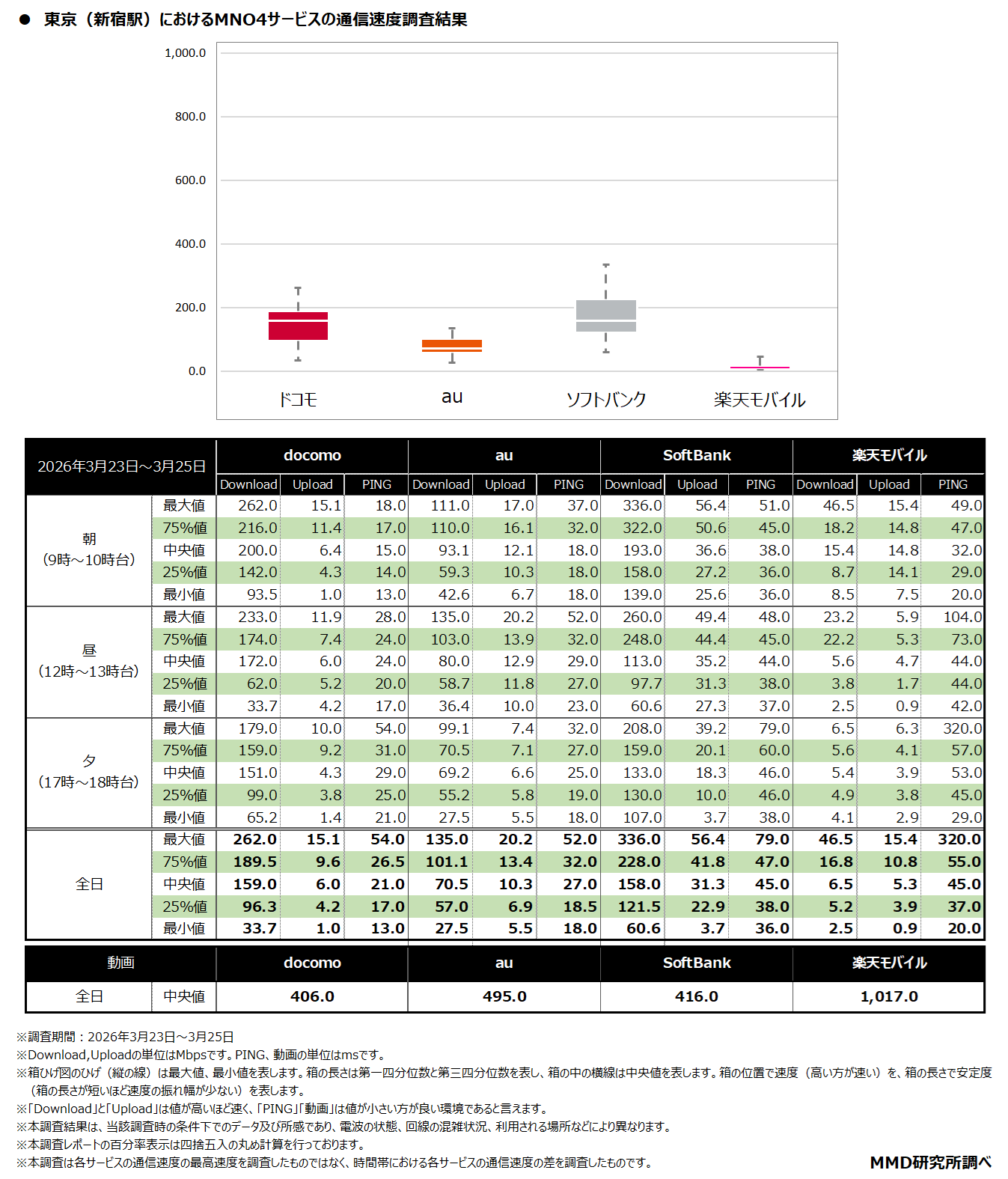 MMDLabo株式会社(東京都中央区、代表取締役:吉本浩司)が運営するMMD研究所は、「2026年3月MNO4サービスの通信速度調査」を実施いたしました。調査結果は以下のとおりです。